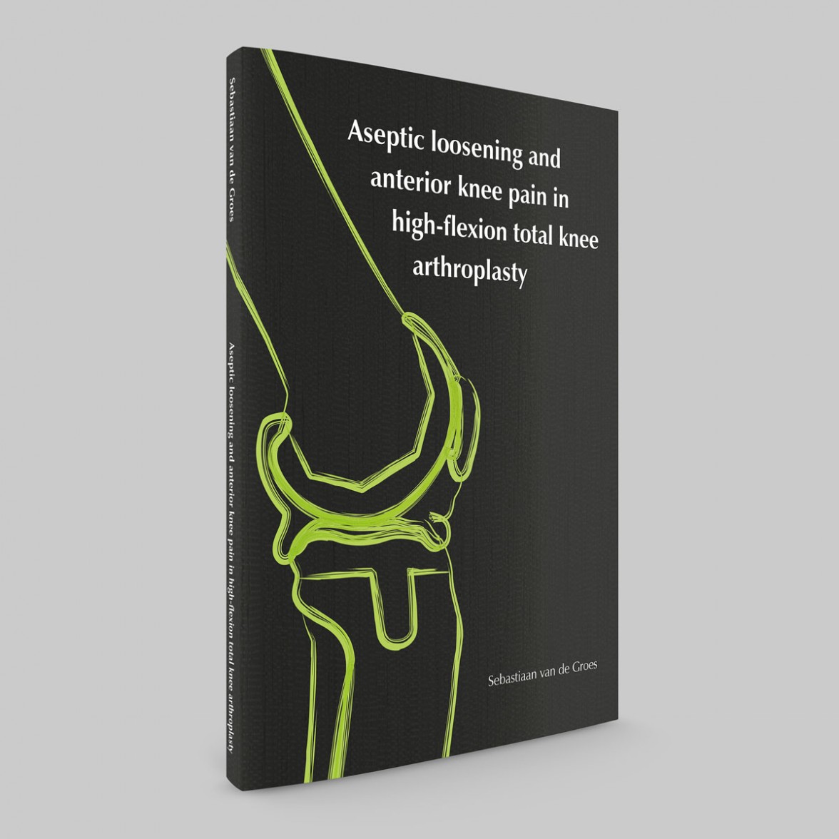 Voor de omslag is gekozen voor een strakke, zakelijke esthetiek. Het ontwerp gebruikt een krachtig contrast tussen diepzwart en neon-groen. Om de techniek achter de knieprothese te accentueren, zijn de contouren van het kniegewricht uitgevoerd in UV-spotlak. Hierdoor lichten de lijnen subtiel op tegen de matte achtergrond, wat de precisie van het onderzoek symboliseert. Bijzonder aan dit project is de toevoeging van een ‘vluchtschrift’: een handzaam miniboekje met de samenvatting voor de gasten.