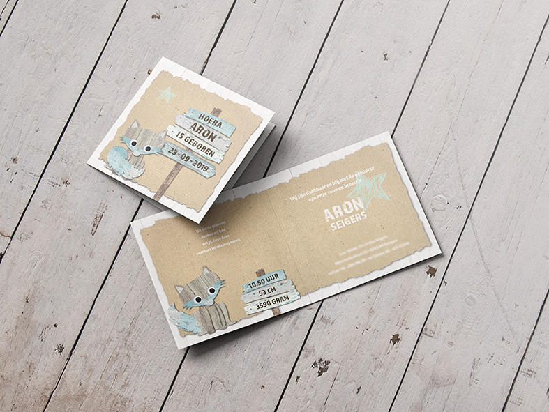 Het kaartje van Eva heeft een stoere houten achtergrond die perfect matcht met de karton-look van hun grote zus. Op de voorkant zie je de uiltjesfamilie compleet op een tak, waarbij het ouder zusje trots de geboortegegevens van haar zusje presenteert op een bordje.