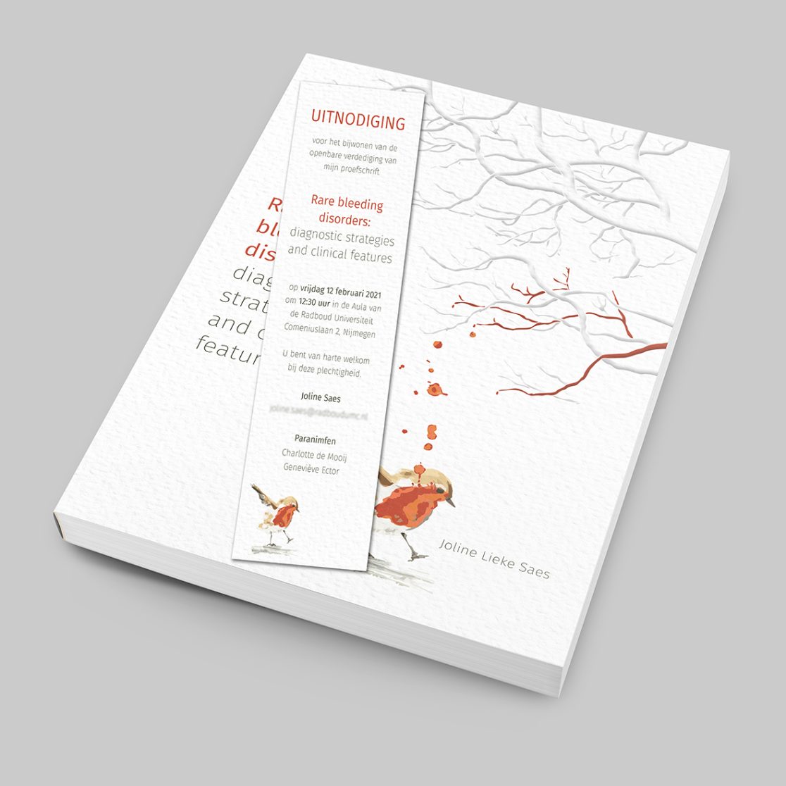 Om de rust in het ontwerp te bewaren zonder aan diepgang te verliezen, is de boom uitgevoerd als een blindpreeg. Hierdoor is de structuur van de vaten niet direct zichtbaar in kleur, maar wel voelbaar wanneer je het boek vasthoudt. Dit subtiele detail nodigt uit tot aanraking en versterkt het serene karakter van het proefschrift. In het binnenwerk keert het roodborstje op subtiele wijze terug bij de tussenbladen