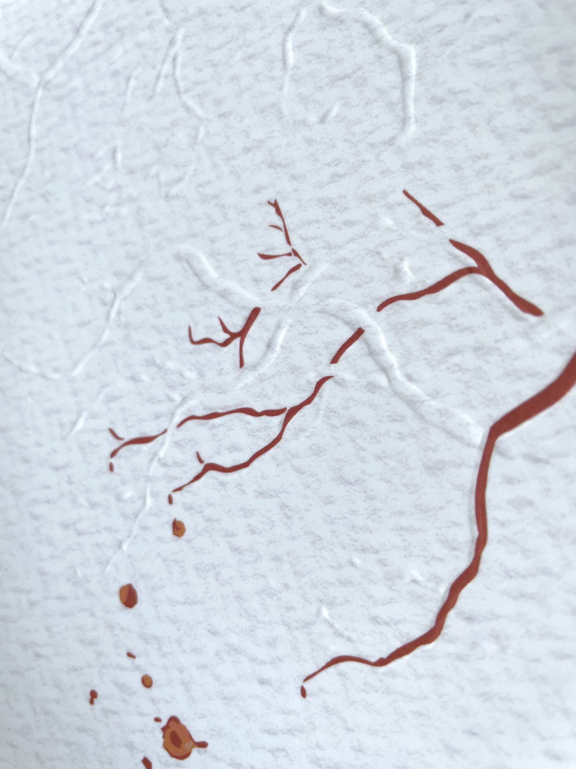 Om de rust in het ontwerp te bewaren zonder aan diepgang te verliezen, is de boom uitgevoerd als een blindpreeg. Hierdoor is de structuur van de vaten niet direct zichtbaar in kleur, maar wel voelbaar wanneer je het boek vasthoudt. Dit subtiele detail nodigt uit tot aanraking en versterkt het serene karakter van het proefschrift. In het binnenwerk keert het roodborstje op subtiele wijze terug bij de tussenbladen