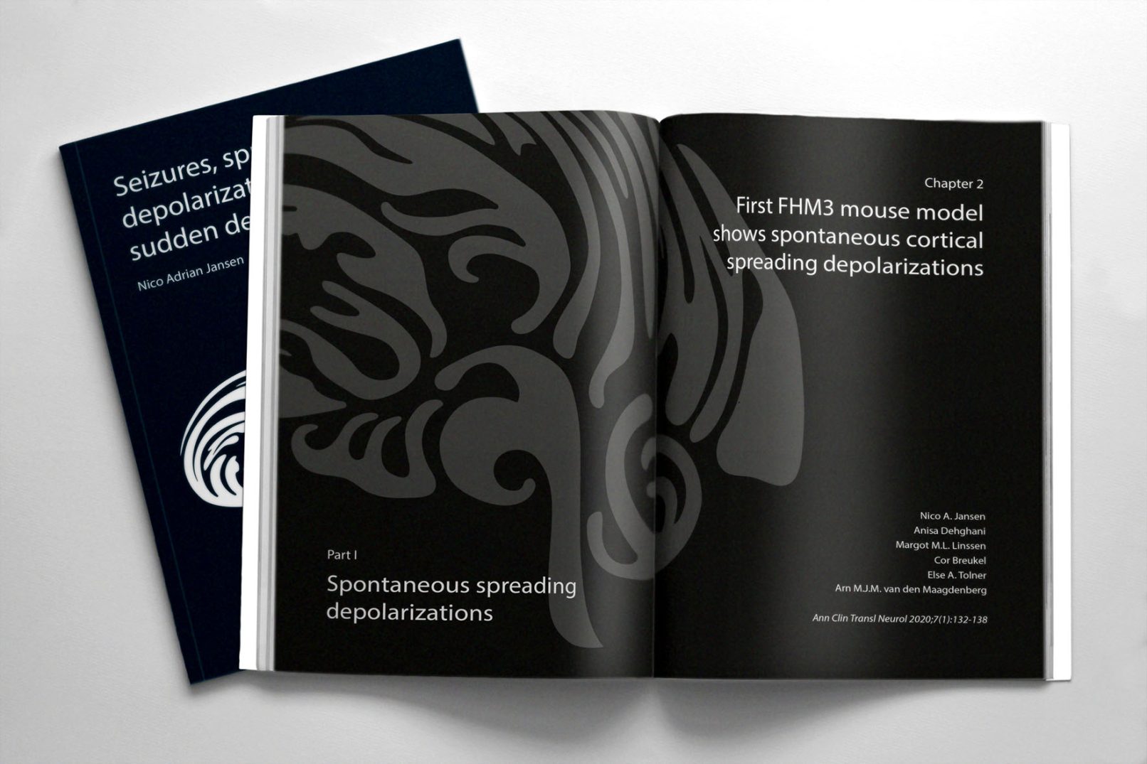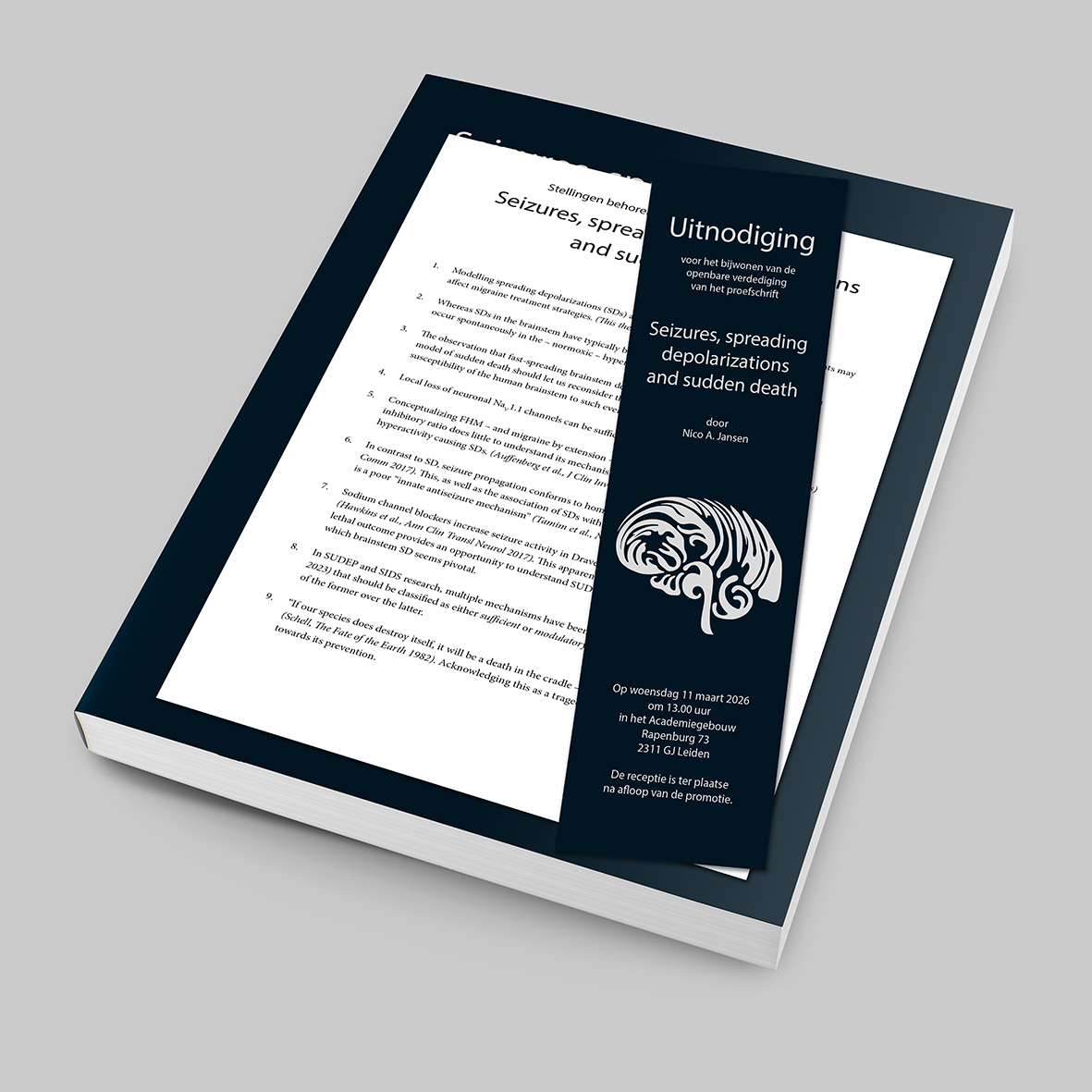 De omslag van dit proefschrift is een oefening in krachtige eenvoud. Centraal staat een abstracte, golvende vorm die op schematische wijze de menselijke hersenen verbeeldt. Door de achtergrond volledig donker en effen te houden, wordt alle aandacht naar de kern getrokken. De hersenvorm en de typografie zijn uitgevoerd in zilverfolie, wat zorgt voor een dynamisch contrast. Juist door het minimalisme krijgen de zilveren accenten een diepere lading; ze vangen het licht en verbeelden de elektrische ontladingen waar het onderzoek over gaat.