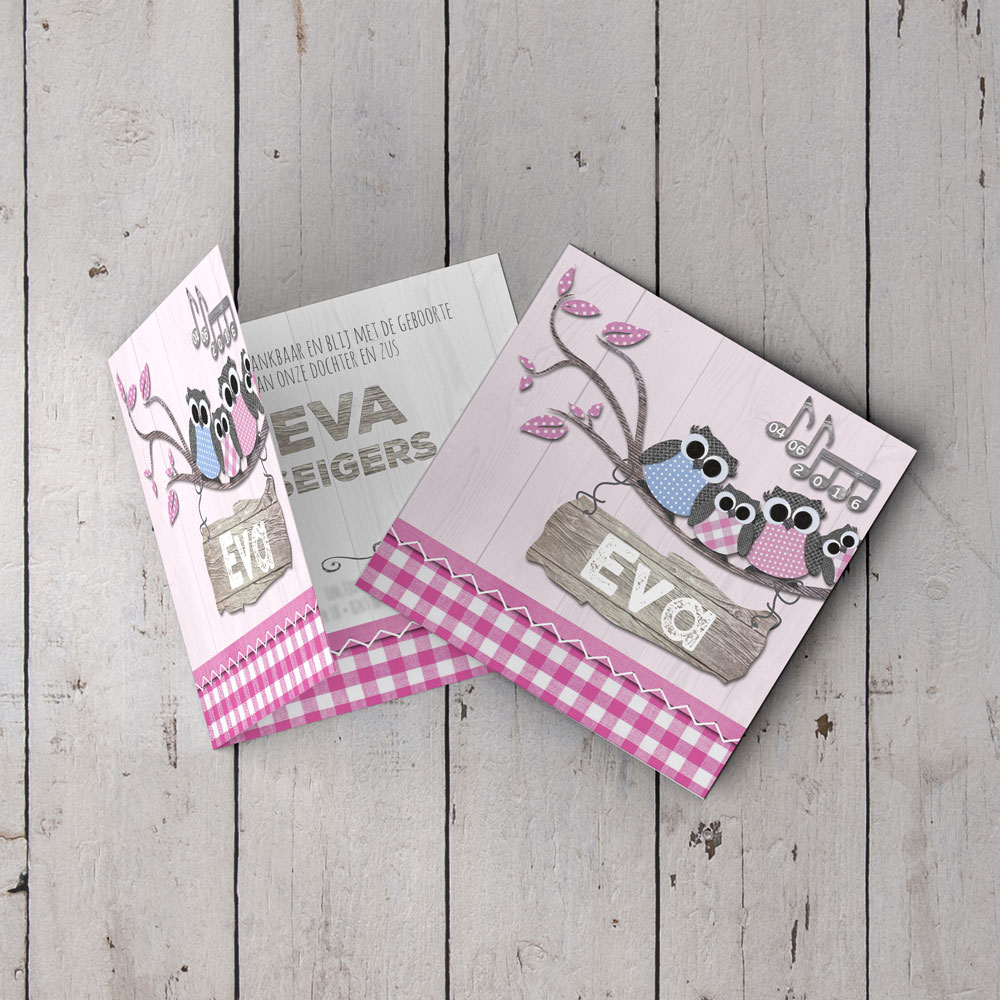 Het kaartje van Eva heeft een stoere houten achtergrond die perfect matcht met de karton-look van hun grote zus. Op de voorkant zie je de uiltjesfamilie compleet op een tak, waarbij het ouder zusje trots de geboortegegevens van haar zusje presenteert op een bordje.